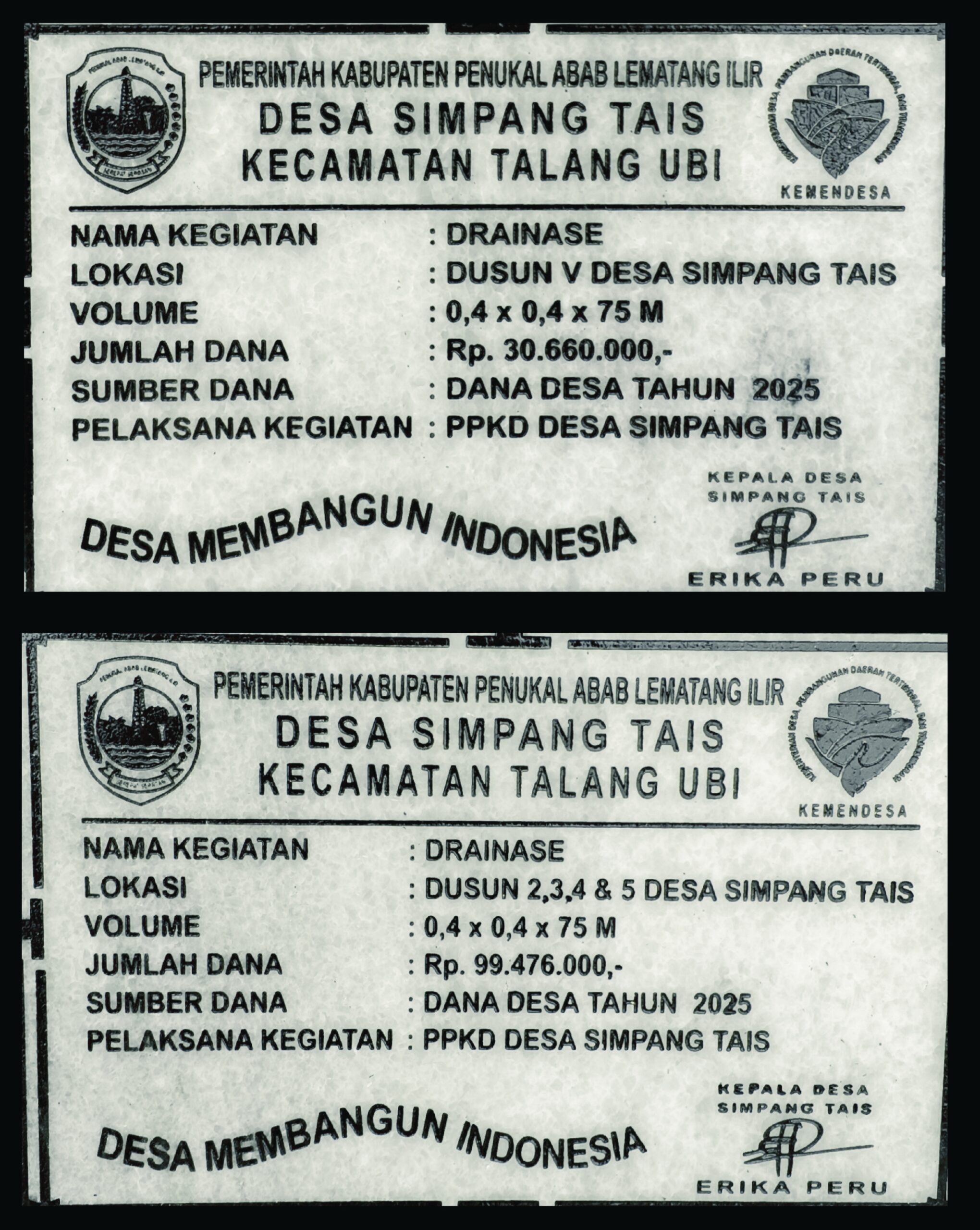 PALI — TEROPONGSUMSEL.COM Dugaan penyimpangan penggunaan Dana Desa (DD) Tahun Anggaran 2025 mencuat di Desa Simpang Tais, Kecamatan Talang Ubi, Kabupaten Penukal Abab Lematang Ilir (PALI). Dugaan tersebut mengemuka setelah Tim Media menemukan kejanggalan pada papan prasasti kegiatan pembangunan drainase yang akan terpasang di sejumlah titik Desa Simpang Tais. Berdasarkan data yang tercantum pada papan prasasti tersebut, ditemukan dua kegiatan pembangunan drainase dengan volume pekerjaan yang sama, yakni 0,4 x 0,4 x 75 meter, namun menggunakan nilai anggaran yang berbeda secara signifikan. Dari perbedaan tersebut, tercatat selisih anggaran…