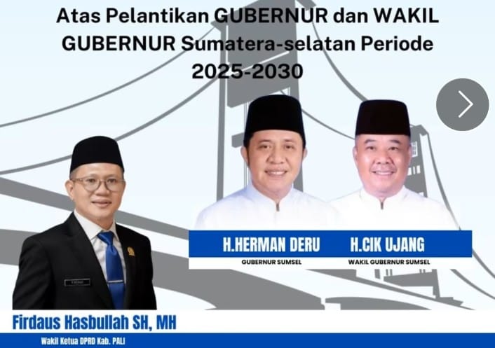 PALI – TEROPONGSUMSEL.COMWakil Ketua DPRD Kabupaten Penukal Abab Lematang Ilir (PALI) Provinsi Sumatera Selatan Firdaus Hasbulah SH, MH, mengucapakan selamat atas telah dilantiknya Pasangan Calon (Paslon) Gubernur dan Wakil Gubernur Sumsel H Herman Deru, dan Wakil Gubenur Sumsel H Cik Ujang, di Istana Jakarta oleh Presiden Republik Indonesia H Prabowo Subianto, Kamis (20/02/2029) pukul 09:00 WIB. “Selamat dan Sukses atas dilantiknya H Herman Deru dan H Cik Ujang, sebagai Gubernur dan Wakil Gubernur Sumsel Periode 2025-2030 oleh Presiden RI H Prabowo Subianto di Istana Jakarta hari ini Kamis 20 Februari…