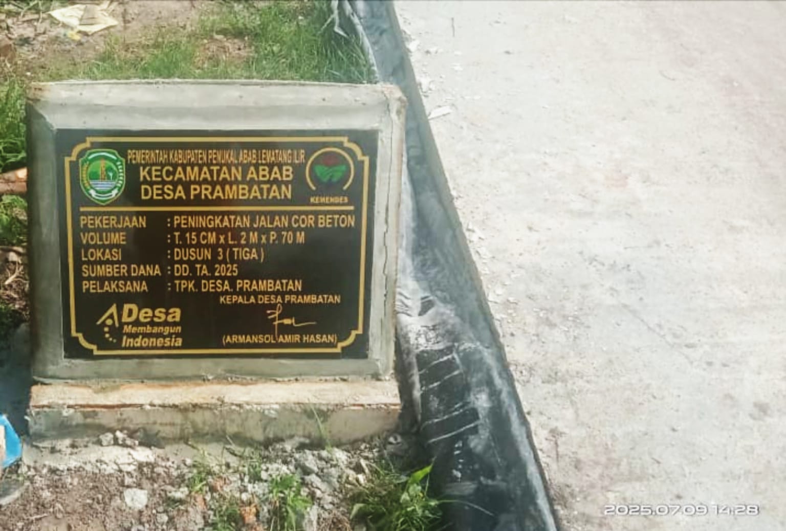 PALI – TEROPONGSUMSEL.COMPemerintah Desa Prambatan, Kecamatan Abab, Kabupaten Penukal Abab Lematang Ilir (PALI), telah merampungkan pembangunan jalan cor beton di Dusun 3 dengan spesifikasi teknis: tebal 15 cm, lebar 2 meter, dan panjang 70 meter. Proyek ini dibiayai melalui Dana Desa (DD) Tahun Anggaran 2025 dan dilaksanakan langsung oleh Pemerintah Desa melalui Penanggung Jawab Pengelola Kegiatan (PPK) desa setempat. Kepala Desa Prambatan, Armansol, saat dikonfirmasi awak media menjelaskan bahwa pembangunan jalan tersebut merupakan usulan prioritas masyarakat. “Jalan itu dulunya merupakan bangunan lama dari program nasional PNPM-MP sekitar tahun 2009. Sekarang…