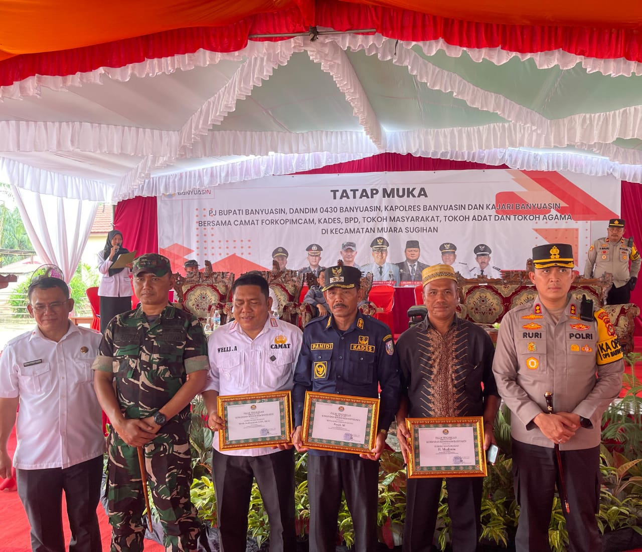 BANYUASIN – TEROPONGSUMSEL.COM Kapolres Banyuasin AKBP Ruri Prastowo SH SIK MIK, Pj Bupati Banyuasin Muhammad Farid S.STPSi, dan Dandim 0430/Banyuasin Letkol Inf. Roni Sugiarto, melaksanakan tatap muka dengan Forkopimcam, Kades, BPD,Tokoh Adat,Tokoh Masyarakat dan Tokoh Agama di Kecamatan Muara Sugihan Rabu (16/10).