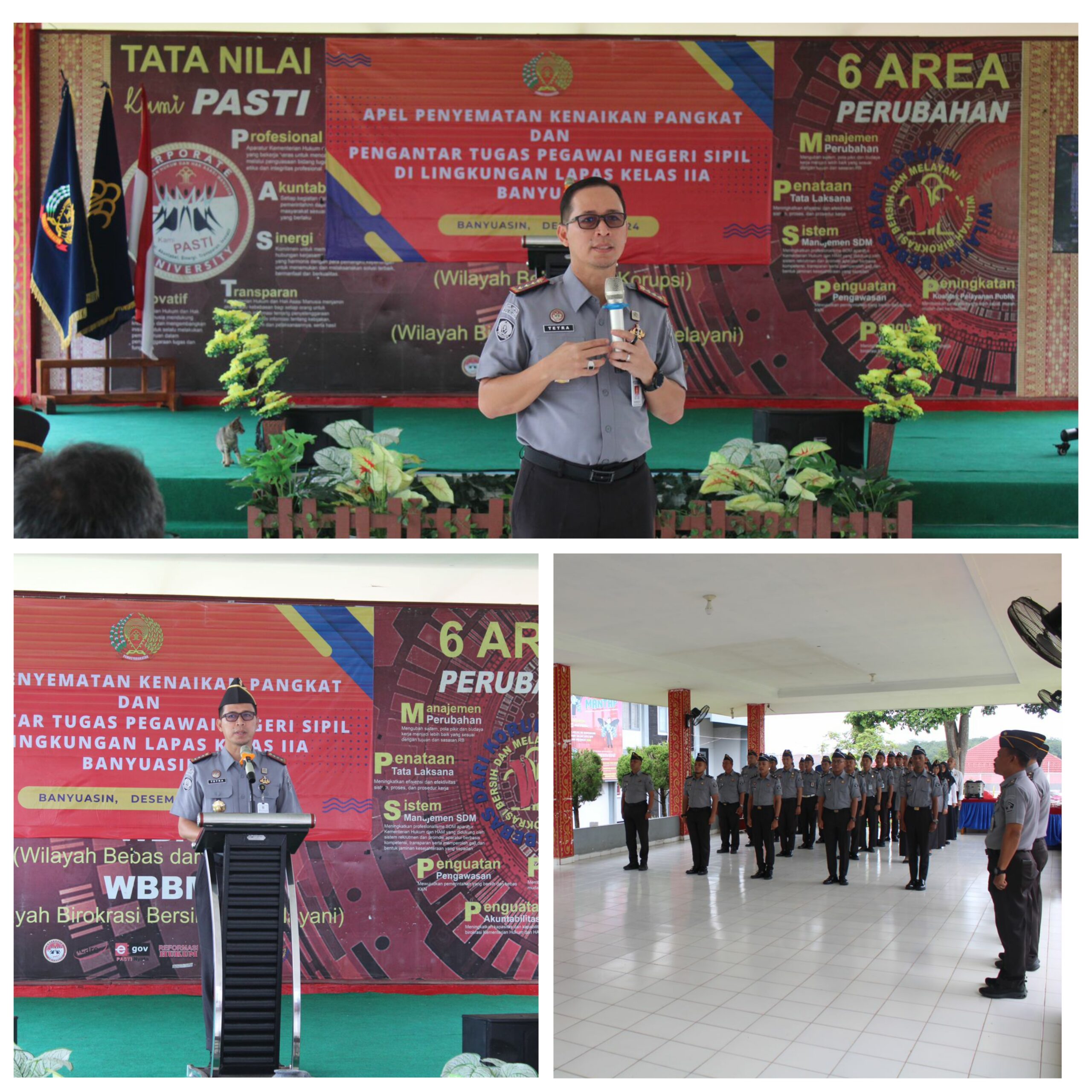 Lembaga Pemasyarakatan (Lapas) Kelas IIA Banyuasin menggelar Apel Penyematan Kenaikan Pangkat dan Kenal Pamit Pegawai yang pindah dan yang baru pada, Selasa (03/12/2024).