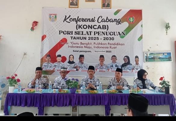 BANYUASIN – TEROPONGSUMSEL.COM Persatuan Guru Republik Indonesia (PGRI) Kecamatan Selat Penuguan melaksanakan Konferensi Cabang (KONCAB) periode 2025–2030 yang dipusatkan di SDN 5 Selat Penuguan kabupaten Banyuasin. Sabtu 13 September 2025 Dengan mengangkat tema “Guru Bangkit, Pulihkan Pendidikan, Indonesia Maju, Indonesia Kuat”, kegiatan ini menjadi momentum penting bagi para pendidik dalam merumuskan arah kebijakan serta program kerja organisasi lima tahun ke depan. Sonhaji, S.Pd., M.S.I., selaku Korwil Disdikbud Kecamatan Selat Penuguan menegaskan pentingnya peran guru dalam meningkatkan kualitas pendidikan di daerah. “Melalui konferensi ini, kita berharap lahir gagasan dan program…