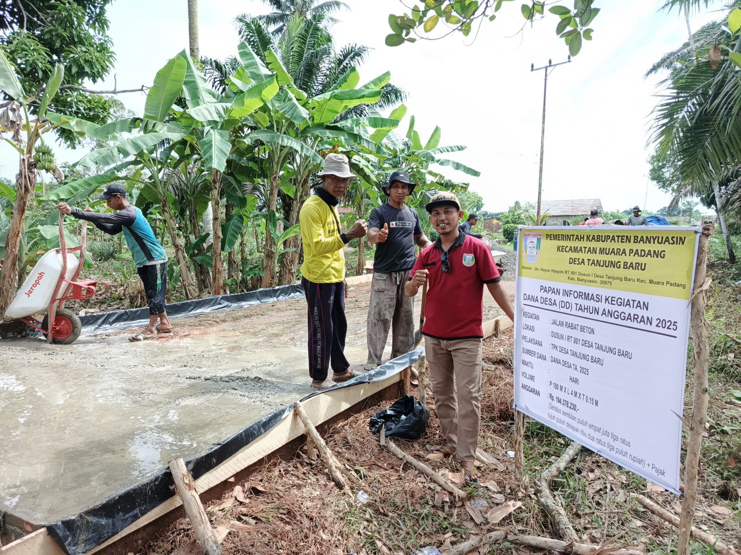 BANYUASIN – TEROPONGSUMSEL.COM Warga merespon dengan antusias pembangunan jalan rabat beton sebagai penghubung antar dusun yang terletak di dusun 01 RT. 001, Desa Tanjung Baru, Kecamatan Muara Padang, Kabupaten Banyuasin Sumatera Selatan (Sumsel), Sabtu (01/11/25) Pembangunan tersebut, berupa jalan rabat beton, merupakan jalan penghubung antar dusun, menggunakan anggaran dana desa (DD) tahun 2025 tahap II, yang telah dialokasikan dalam Anggaran Pendapatan dan Belanja Desa (APBDes) Desa Tanjung Baru Tahun 2025. Pembangunan jalan rabat beton ini memiliki volume 180 M X 4 M X 0,15 M, dengan total anggaran sebesar Rp.…