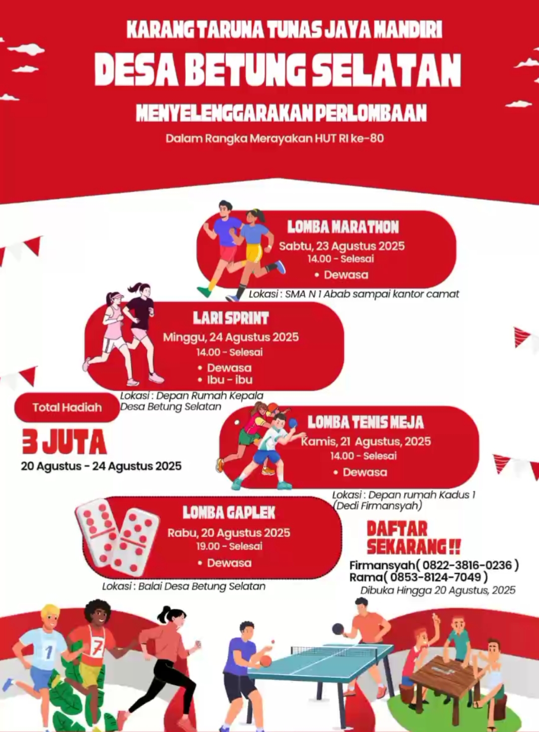 3. Lomba Marathon (Dewasa) Sabtu, 23 Agustus 2025, lokasi14.00 WIB – selesai