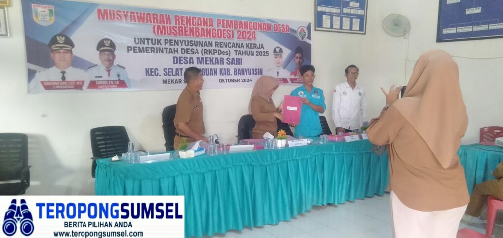 Dalam rangka penyusunan rencana kerja pemerintah Desa (RKPDes) tahun anggaran 2025 di Desa Mekar Sari Kecamatan Selat Penuguan Kabupaten Banyuasin Sumatera Selatan, Badan Permusyawaratan Desa (BPD) Mekar Sari Gelar MUSRENBANGDES, Senin 21 Oktober 2024.