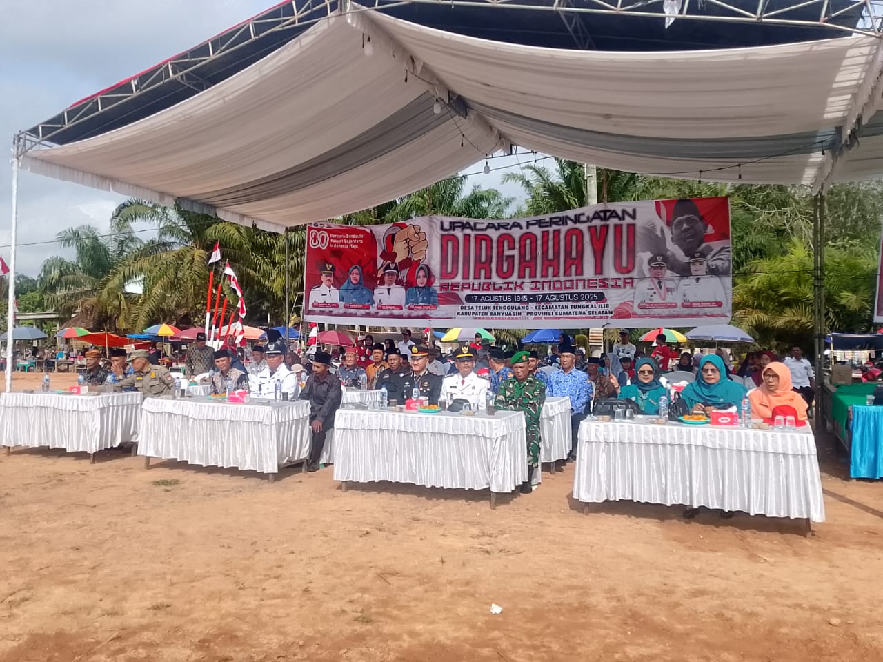 Peringatan Hari Ulang Tahun (HUT) Kemerdekaan Republik Indonesia ke-80 di Desa Teluk Tenggulang, Kecamatan Tungkal Ilir, Kabupaten Banyuasin, Provinsi Sumatera Selatan berlangsung meriah. Ratusan masyarakat sejak pagi memadati lapangan sepak bola desa, Minggu (17/8/2025).