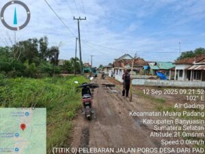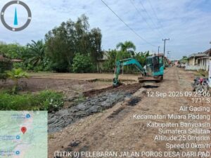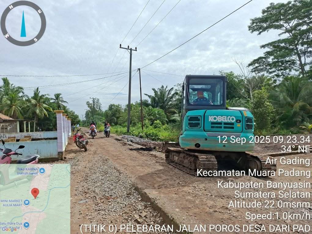 BANYUASIN – TEROPONGSUMSEL.COM Pemerintah Desa Air Gading Kecamatan Muara Padang bersama masyarakat melaksanakan kegiatan gotong royong pelebaran jalan poros yang menghubungkan beberapa desa di wilayah tersebut. Jum’at 9 September 2025